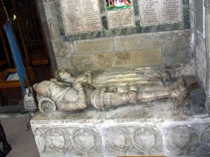 The alabaster figures of the knight and lady are thought to be Bosvilles and date from around 1400. There are World War 1 and 2 memorials on the walls alongside. The window is from 1900 in memory of the Taylor family